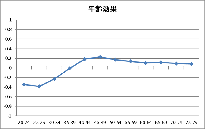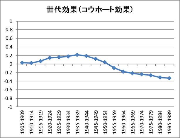 コウホート分析で算出された、時代・年齢・世代の各効果を以下に示す。