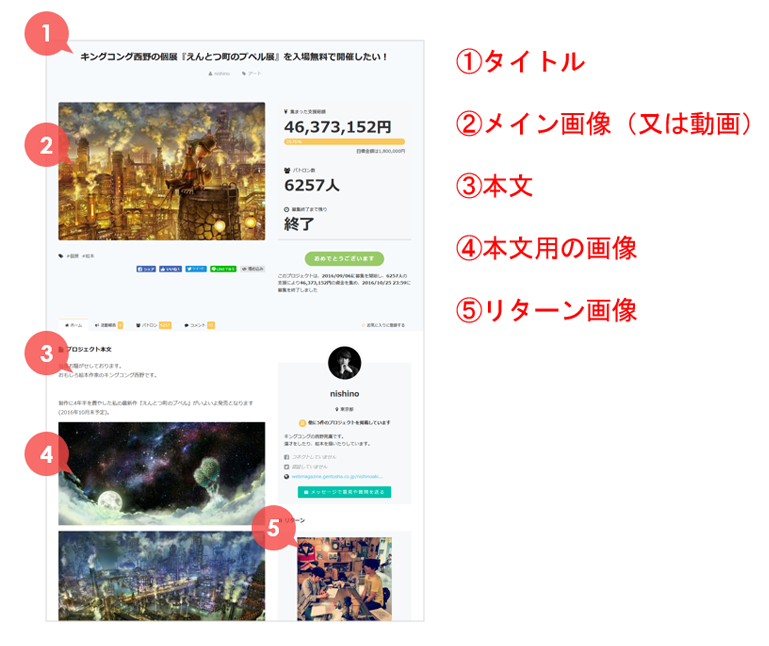 プロジェクトページはHTMLなどの知識がなくても、ブログを書くような感覚で作成することができます。 必要な素材はタイトル・画像・本文などで、動画を入れることもできます。