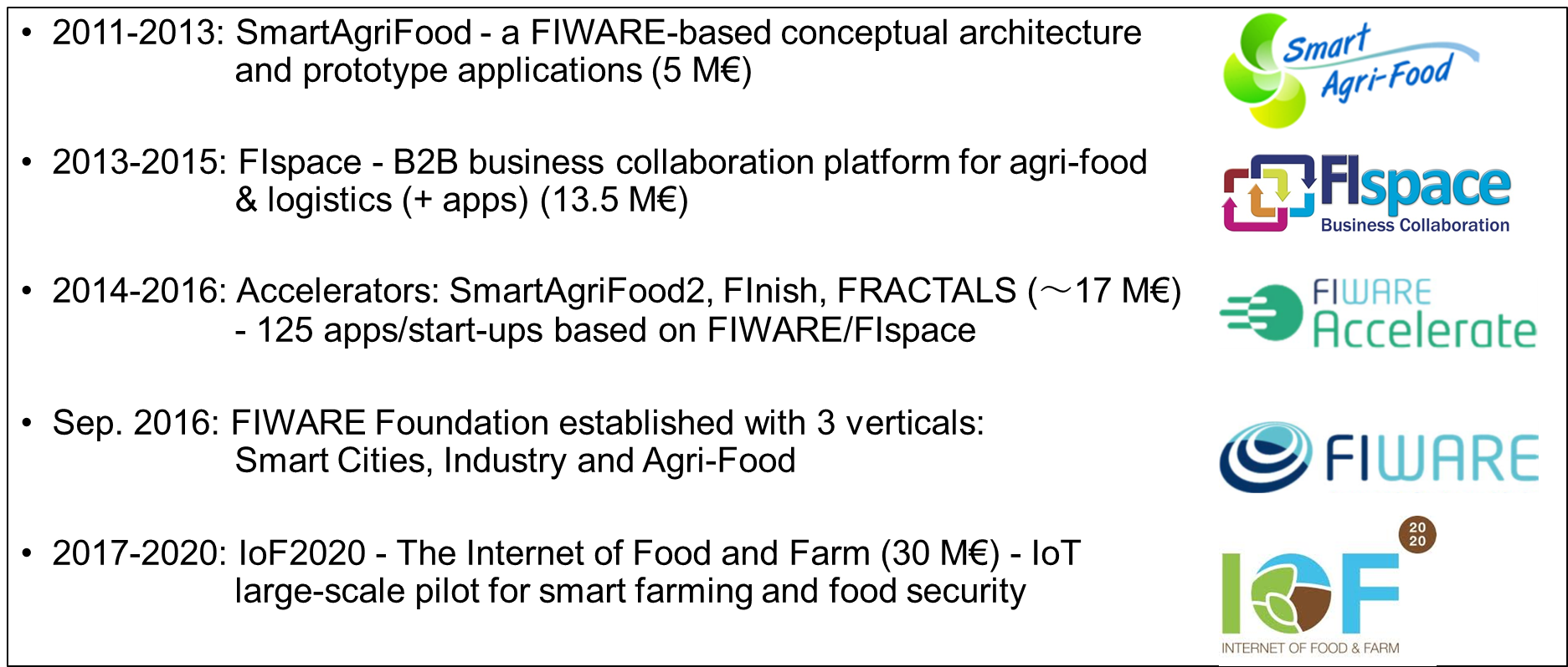 次世代インターネット技術における欧州の競争力強化と、社会・公共分野のアプリケーション開発の支援を目的に、EUでは2011年から5年計画のFI-PPP(Future Internet Public-Private Partnership)プログラムが3億ユーロ(約390億円)の予算の下で実施され、農業分野でも2011年から2013年にかけてSmartAgriFood、2013年から2015年にかけてSmartAgriFoodとFINEST(物流プロジェクト)が一体となったFIspaceが実施されました。このFI-PPPの特徴は、データ管理、IoTデバイス管理、ビッグデータ分析機能などの基盤ソフトウェアの研究開発を行うFIWAREにあります。この基盤ソフトウェアはスマート農業プロジェクトなどでの実証を支えるとともに、オープンソースソフトウェアとして世界中で利用可能です。この流れの中で、精密農業は、ICT(Information and communication technology:情報通信技術)を核とし消費者起点のマーケットイン型のスマート農業にコンセプトが移行すると共に、FI-PPPは後継プログラムのHorizon 2020に引き継がれ、食・農業分野では2017年に開始されたIoF2020により欧州各地でスマート農業とフードシステムの実証実験が始まっています。