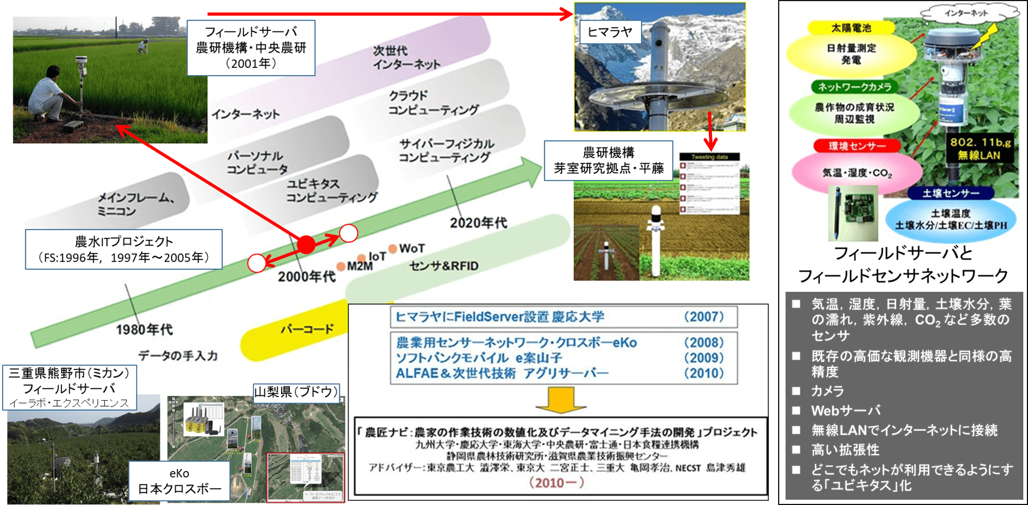 日本では世界に先駆けて1996年から2005年まで圃場での生育環境の計測やその結果生まれるビッグデータ(当時は増殖データと呼んでいた)の活用のための研究が二宮先生と平藤先生(この連載の1回と2回の担当)のリーダーシップの元で推進され、図に示すようにさまざまな要素技術が生まれました。この図の研究の後を受けて、現在戦略的イノベーション創造プログラム(SIP)の次世代農林水産業創造技術(アグリイノベーション創出)の研究開発が行われ、スマート農業の要素技術開発と実証実験が行われています。