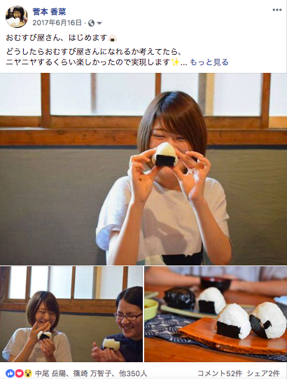その後、みなさんの応援コメントや「いいね」も後押ししてくれておむすび屋として活動することを決断。その報告をSNSで行いました。いいね数は350、総コメント数も50件を越えました。この時点ですでにたくさんの方が私のプロジェクトについて知っていて、応援してくれている状況です。