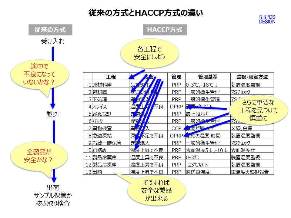 この表で、従来方式は工程とすれば一つだが、HACCP方式では13工程になる。単純な考え方だが従来から比べて13倍安全対策をしていることになる。