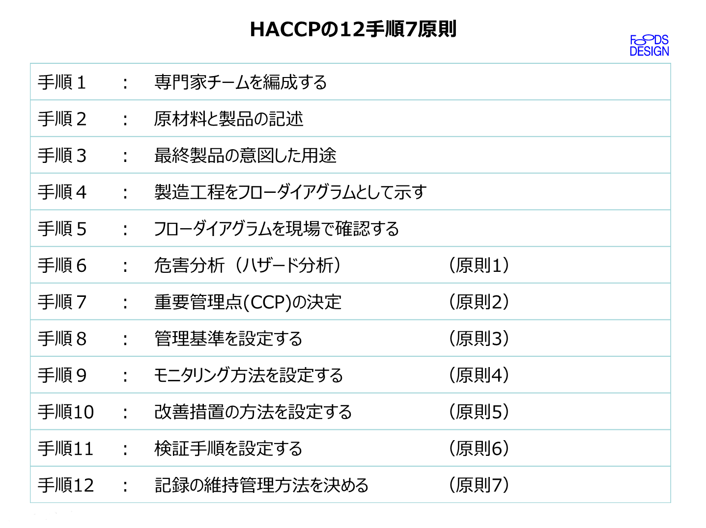 製品から危害を除去するHACCPは、12手順7原則になる。