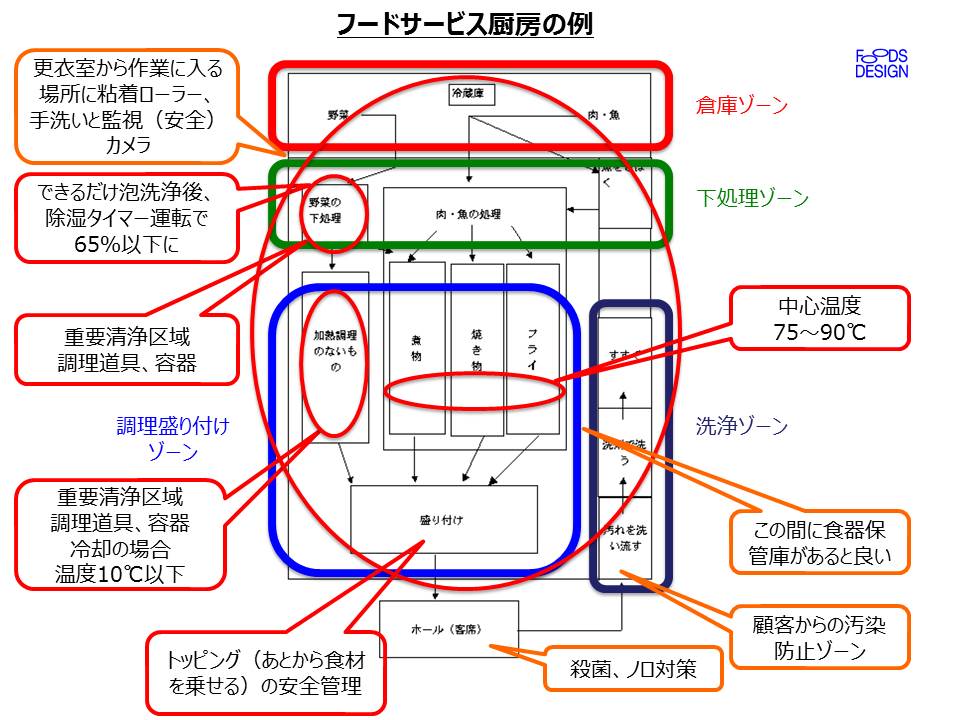 調理の下処理工程では、サラダなどの非加熱メニューになる場所を決めて、そこを重要清浄箇所にする。その後の組み立て調理場所もサラダの場所を決める。加熱調理メニューはすべて中心温度で管理する。ここが簡易CCPだ。料理の上に乗せるトッピング(ラーメンの具など)具材が温度上昇などで細菌増殖の危険があるため、出しっぱなしにしないで、冷蔵庫から出すようにする。ホール(客席)から戻ってきた食器が料理場所と交差汚染しないように、洗浄ラインを明確にしておく。そして、顧客が店に入るときに汚染を持ち込まないように、殺菌液を置くようにする。