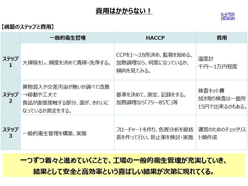 一般衛生管理とHACCPの構築は、費用は殆どかからない。
