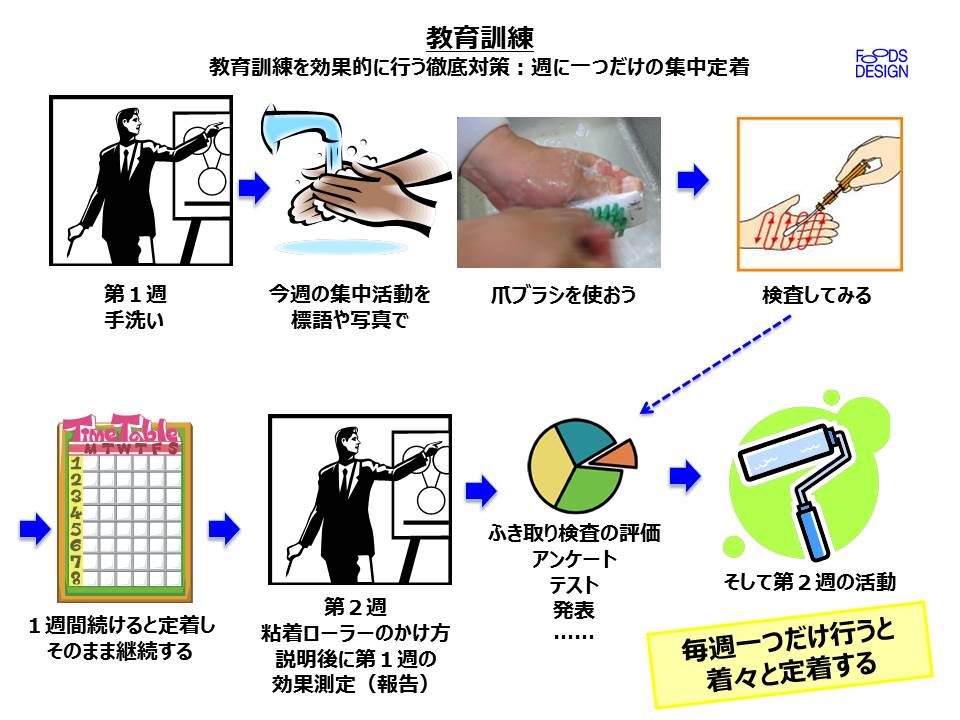 良い方法は、一度に(例えば毎週月曜日の昼休みのあと5分間)一つだけ教え、それを強化週間にして定着させることだ。例えば手洗いの方法を、手順だけでなく、手洗い場所に時計を置き「一分間洗うこと」という具体的なルールまで決めて、一週間継続すると、定着する。そして、翌週は別の内容を教え、また一週間強化する。このように毎週一つだけ行うのが効果的だ。2つ以上教えても出来ない。