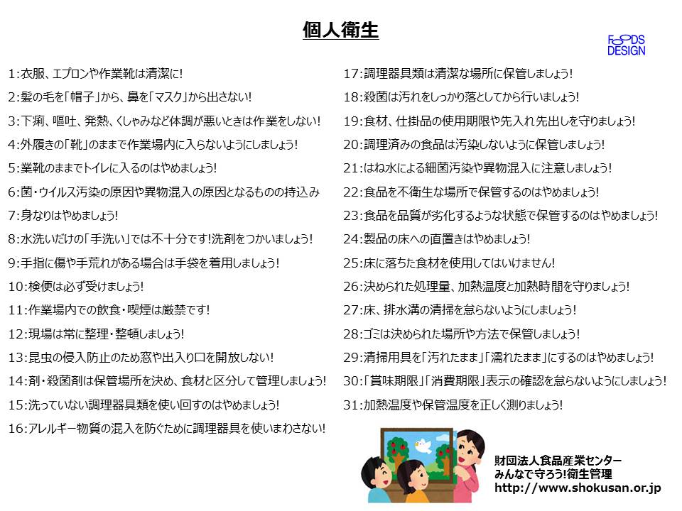 最も基本的なのは手洗いだが、これをいつも家でやっているからと適当にしてしまう傾向がある。食品工場での手洗いは、僅かな食中毒菌やノロウイルスでも製品に付着して広がってしまうので、徹底することが必要だ。この31項目の教育内容は、食品産業センターから無料で入手できる紙芝居形式の教材だ。こういったものを使って、従事者の教育訓練を定期的に行うことが安全につながる。