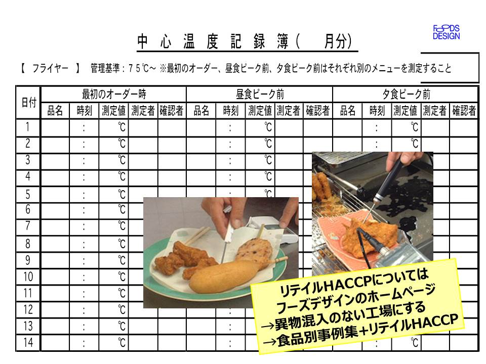 加熱するアイテム、例えばフライ製品などは、最初の調理のときに中心温度を測定するだけでかなり安全確保できるし、そのあと1〜2回測定すればなお良い。もう一つの方法は、アイテムごとに加熱温度と時間の検証をしてみる。トンカツだったら、調理枚数を決めてフライヤーに入れ、それぞれの枚数を何秒揚げたら、中心温度が規定通りになるかをやってみる。そしてそれを表にする。こうすれば、枚数と時間が明確になり、油の温度を一定にすれば安定して出来る。これをやっておけば、あとは表の通りの調理をするだけだ。年に一度程度再検証する。
