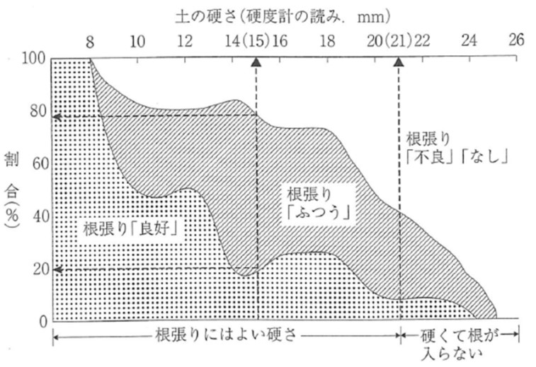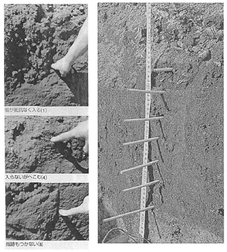 作物の生育の良し悪しを知るために、どのくらいの深さまで、どのくらいの量の根が入っているかを観察します。根張りの制限要因としては、①土壌が硬い、②土壌が過湿である、ことがあげられます。