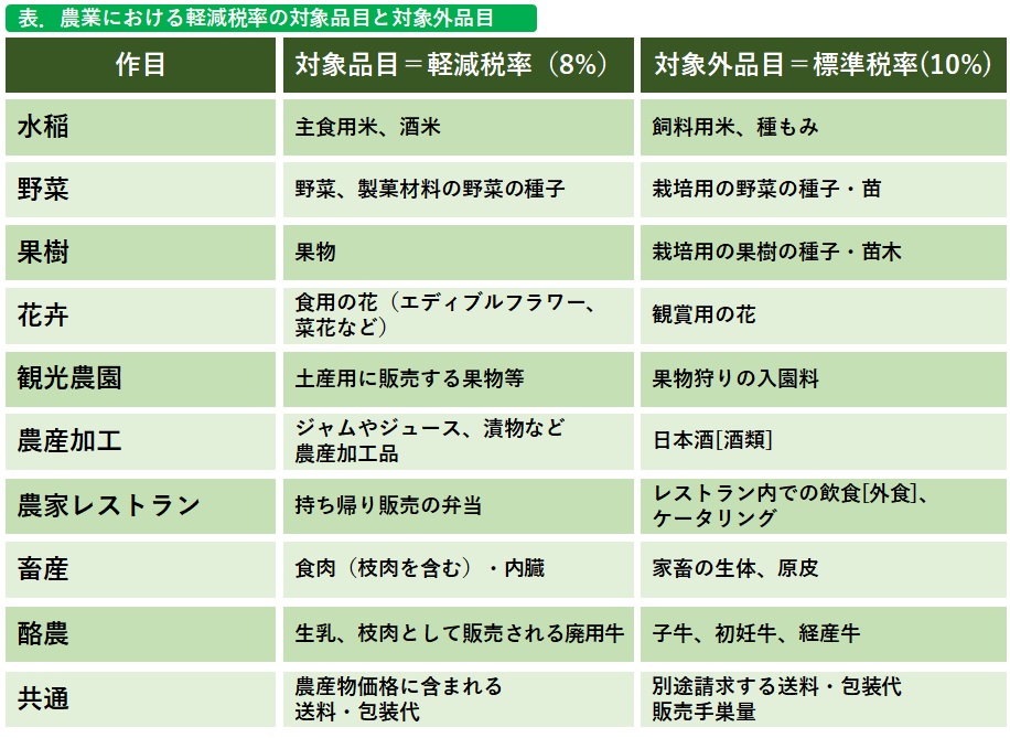軽減税率の対象となる農産物は、人の食用として販売したものです。「米」を例にとると、人の食用として販売される「主食用米」は軽減税率の対象ですが、家畜の食用として販売される「飼料用米」は軽減税率の対象になりません。「種もみ」は稲の栽培用として販売されるものですので、軽減税率の対象になりません。