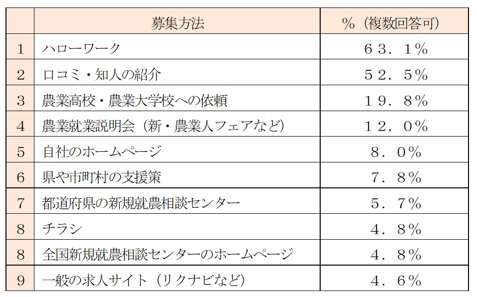 正社員の募集方法については「農業法人等の雇用の実態と改善の記録(2012年度)」(全国農業会議所発行)によると、下記のような募集方法が多くとられています。農業という特殊性、その規模、地域性などを考え併せても、おおよそ次のような優先順位と考えられるでしょう。