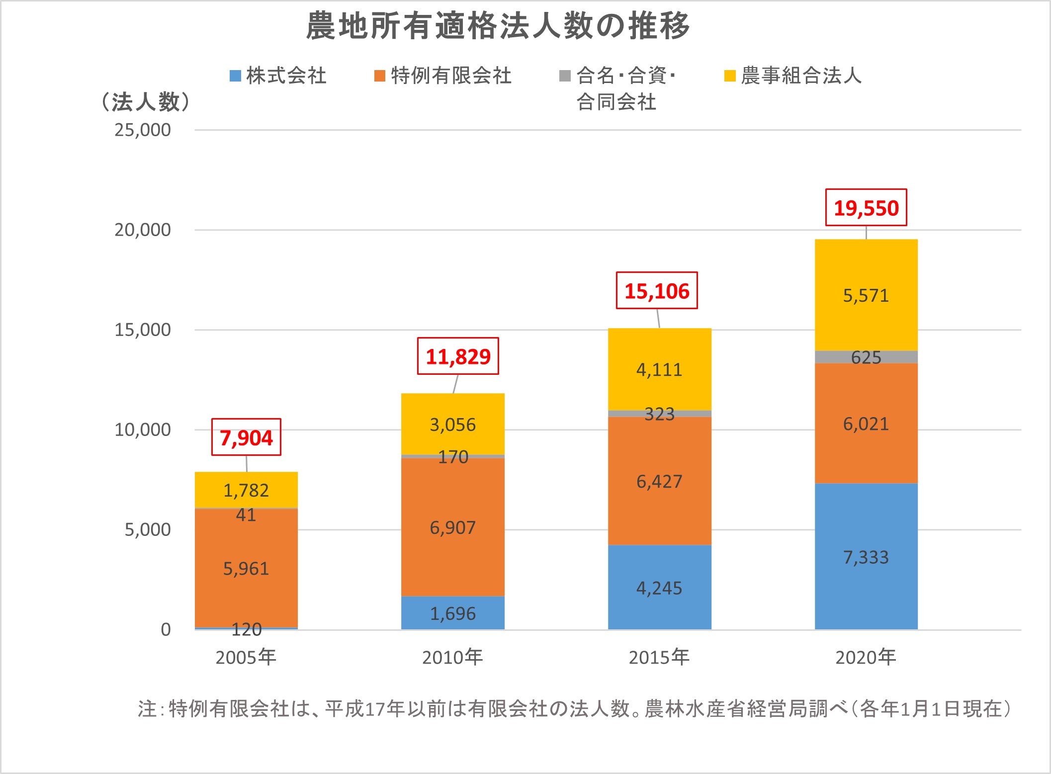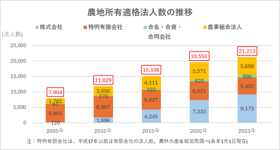 農地を利用して農業経営を行う農地所有適格法人は、2023年1月1日現在2万1,213法人となっています。