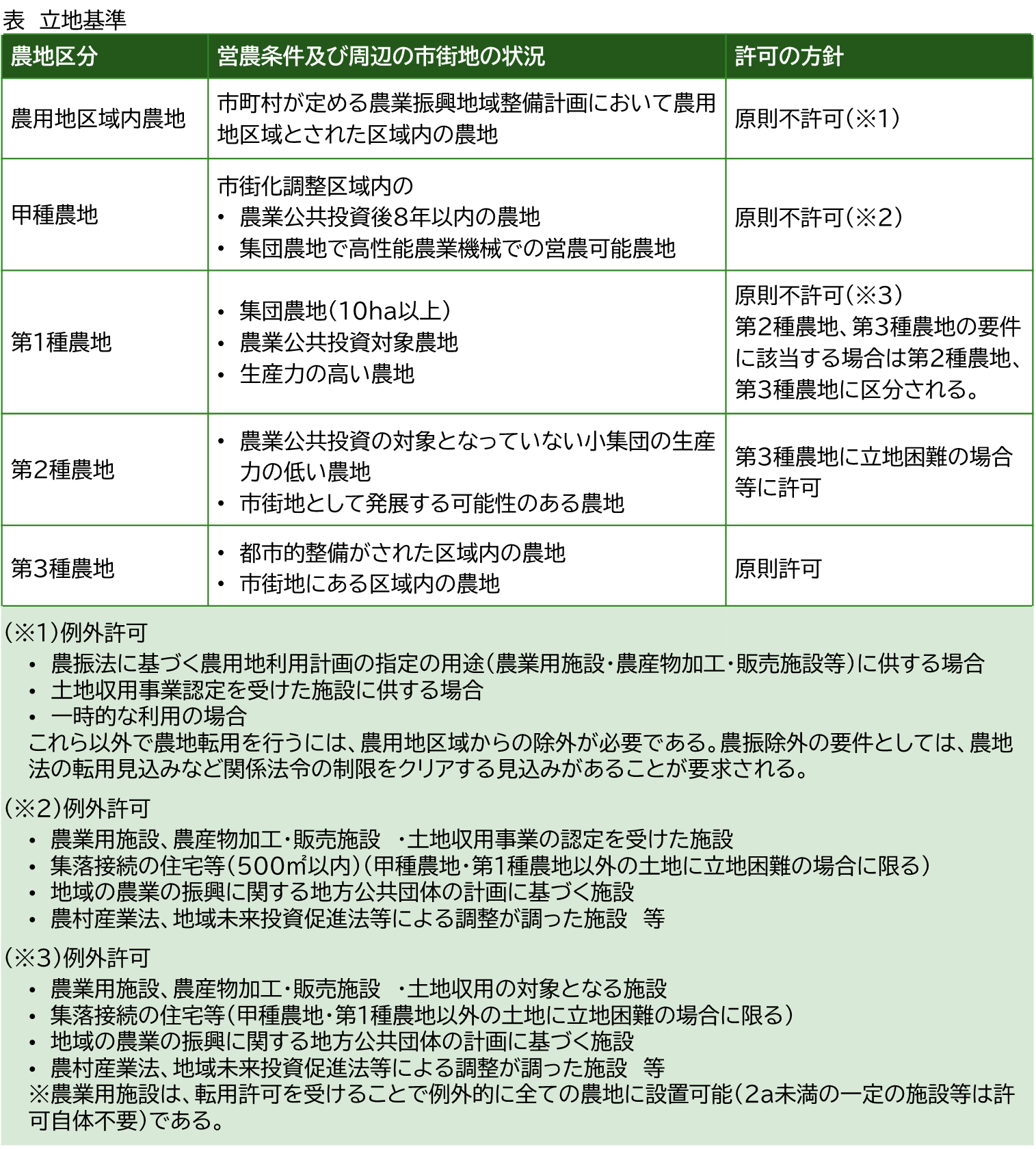 営農条件及び周辺の市街地の状況から農地を区分し、当該区分に応じて許可方針を定め、市街地に近接した農地や生産力の低い農地などから順次転用されるようになっています。