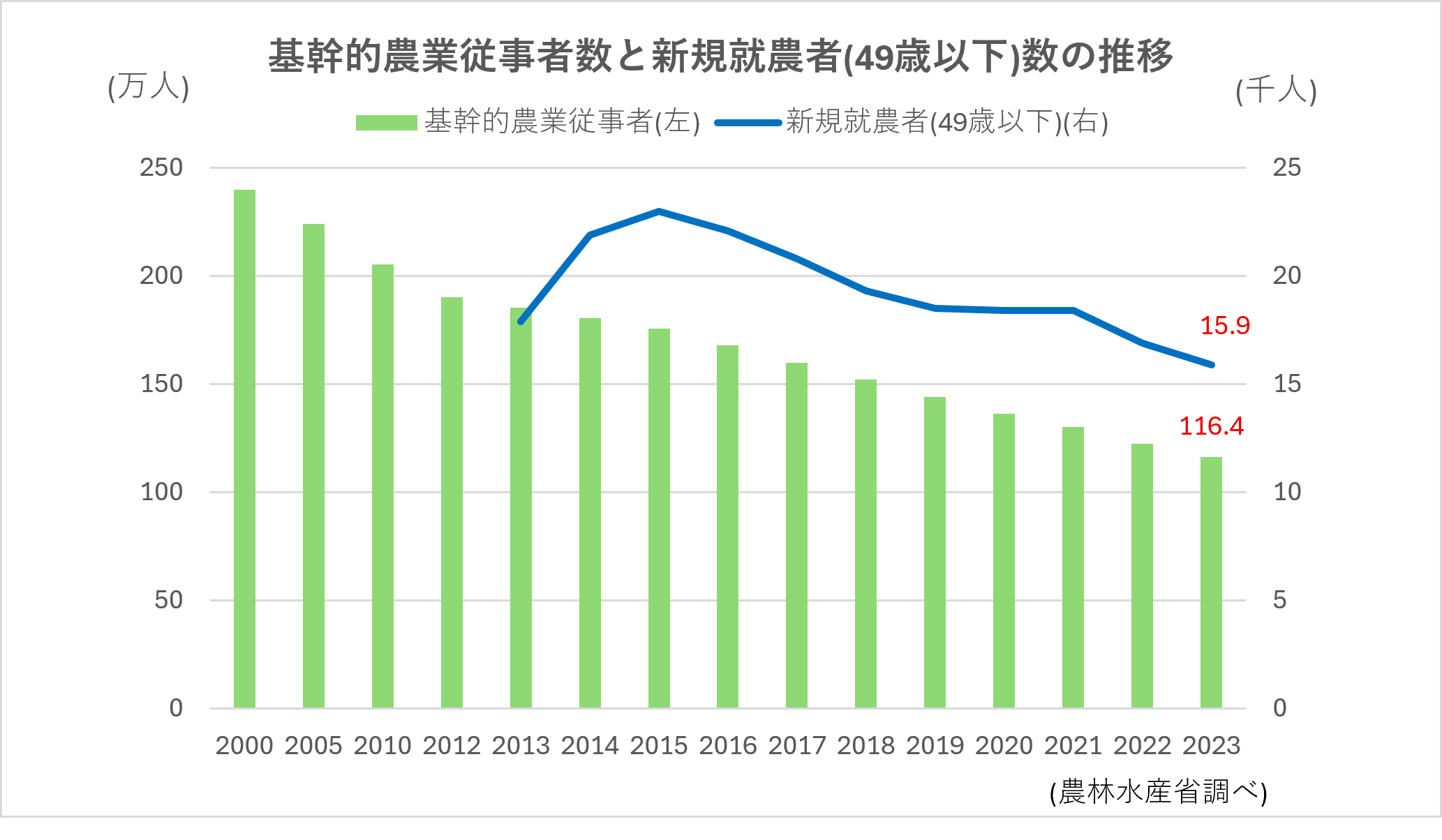 基幹的農業従事者(主に仕事として農業に従事している者)数は、2000年の240万人から2015年は175万7千人、2023年は116万4千人と、減少傾向にあり、この約20年間で半減しています(図参照)。