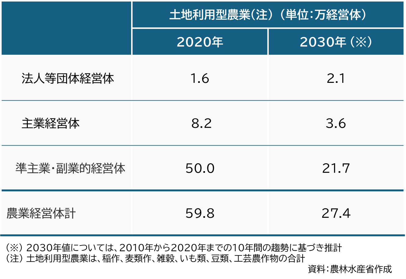 土地利用型作物は、2030年に経営体数が27万経営体と2020年対比で半減する見通しであり、経営規模の拡大を考慮せず試算すると、農地利用が約70万ha減少するおそれがあります。