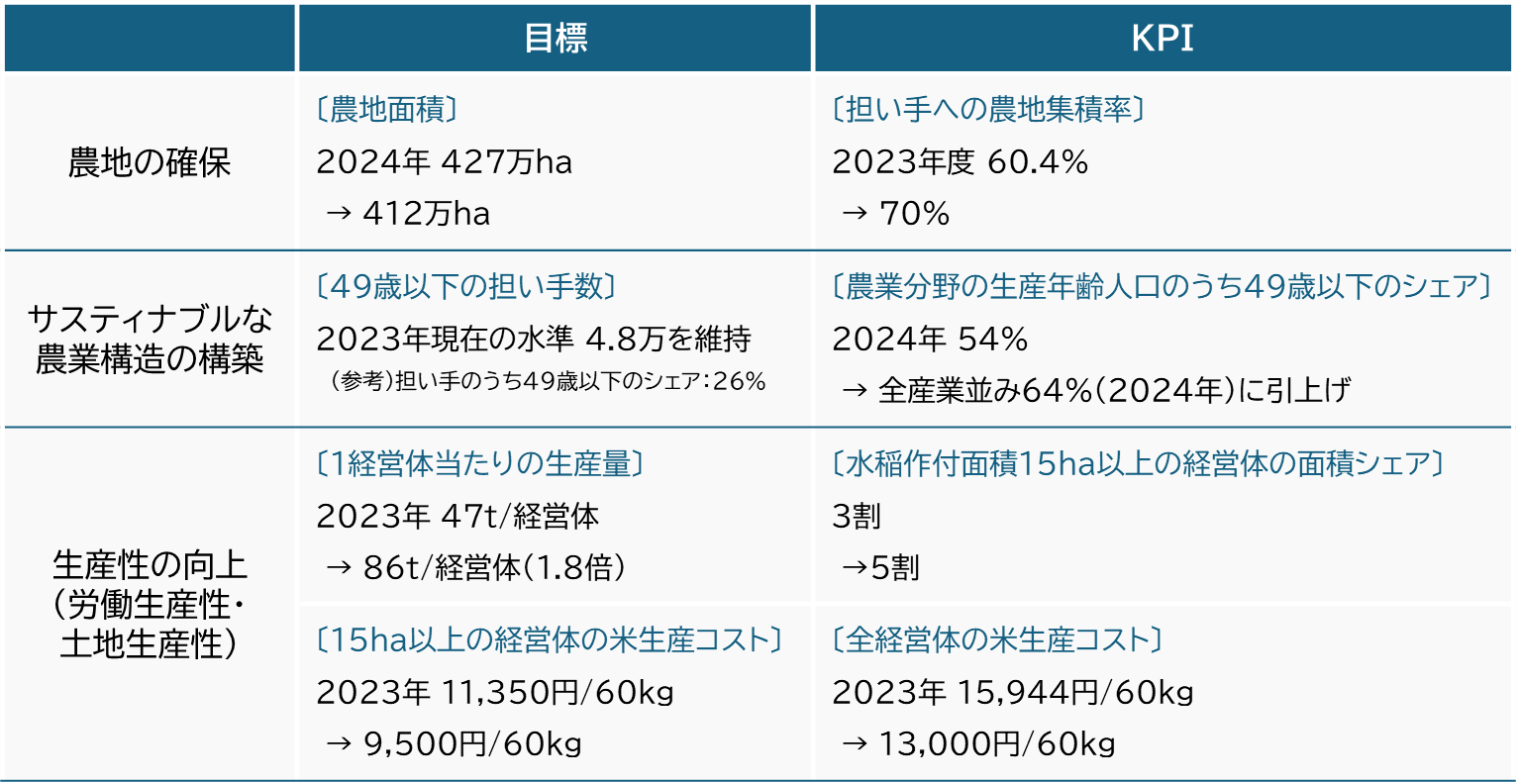 新たな基本計画は、初動5年間で農業の構造転換を集中的に推し進めるため、計画期間は5年間となっています。また、新たな基本計画では、計画の実効性を高めるため、食料安全保障の確保に関する目標(KPI)を設定し、施策の不断の見直しを行うこととされています。
