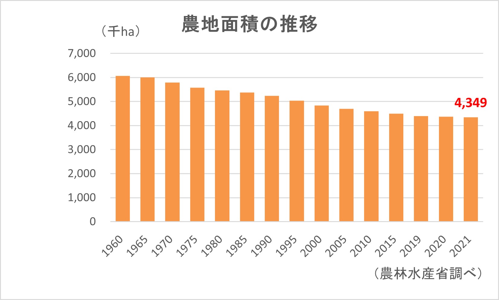 農地面積の長期的な推移を見ると、主に宅地等への転用と荒廃農地の発生等により、農地面積が最大であった1961年の609万haに比べこの約60年間で約179万ha減少(30%減)となっています。