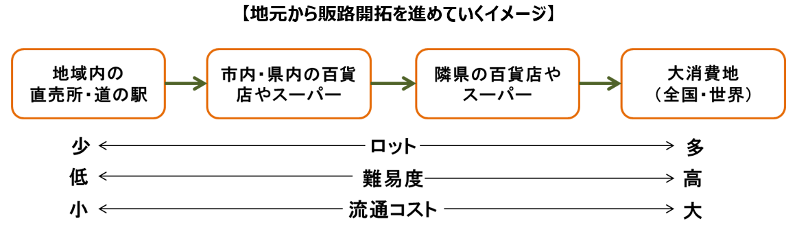 その後、安定的に販売や生産(ロットの確保)ができるようになってから、より高難度で、流通コストも高い、地元のスーパーや百貨店などにもアプローチし、最終的に大消費地、さらには世界を目指しましょう。
