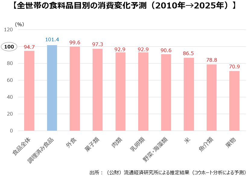 上表は、流通経済研究所による2010年を100とした場合の2025年の品目別の日本国内の消費金額(推定値)です。