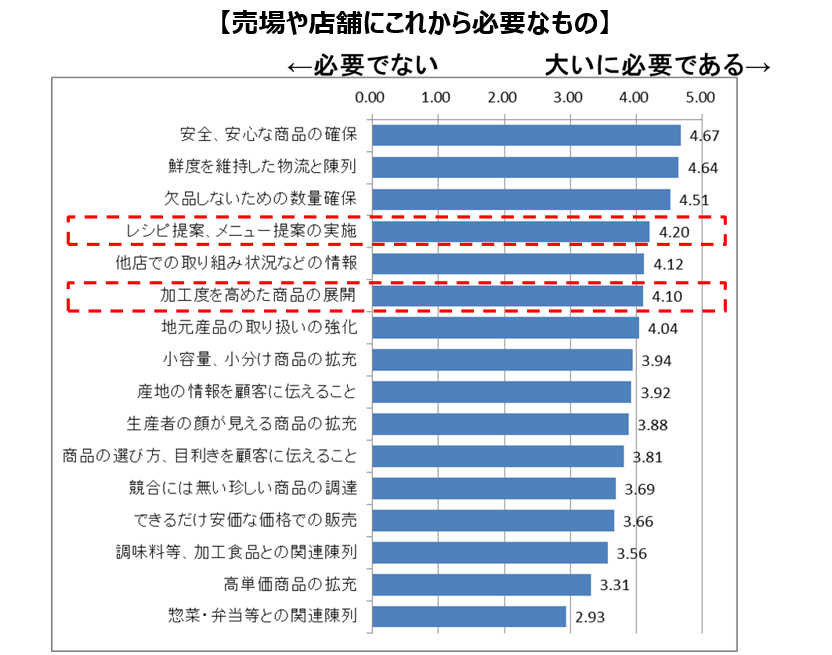下表は、2015年に流通経済研究所で実施した青果部門の生鮮バイヤーへのアンケート結果です。これからの売場や店舗に必要なものについて、大いに必要(5点)から、必要ではない(1点)までの間でバイヤーに選択してもらいました。