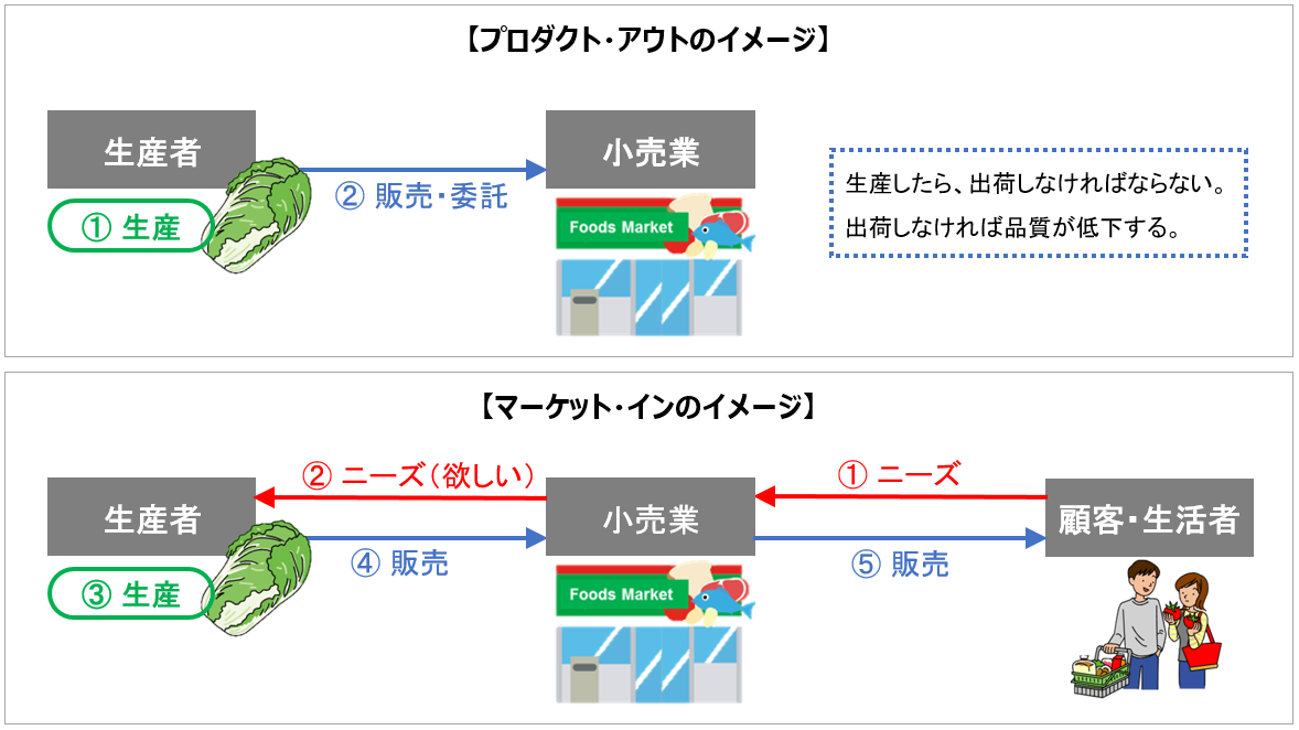顧客のニーズに合わせた生産を行い、販売する方式を「マーケット・イン」と呼び、生産者起点で生産したものを販売する方式を「プロダクト・アウト」と呼びます。