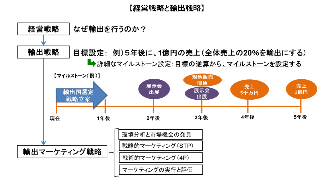 その際には、経営戦略の中でしっかりと輸出事業を位置づけておく必要があります。経営戦略上、輸出事業をどのように位置づけるか、明確化することによって、具体的な目標を設定することができるのです。