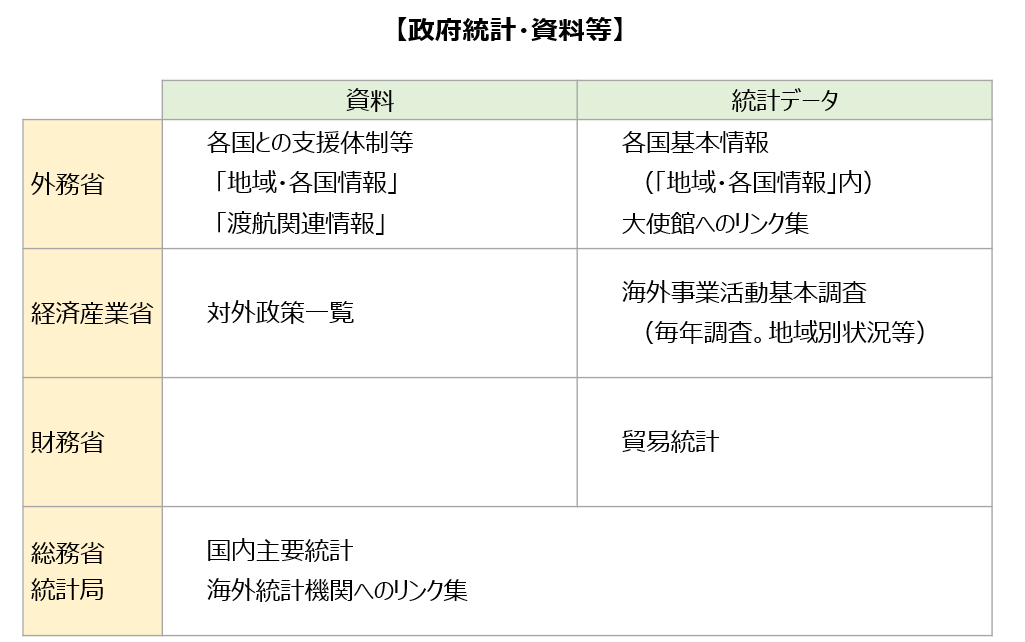また、JETRO以外の主要な政府統計や資料を以下に示します(下表)。