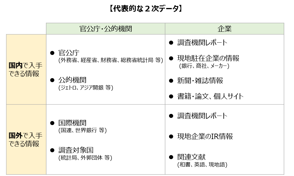 データには、自分が調査したデータである1次データと、他者が調査したデータである2次データが存在しますが、まずは誰かが調べて公開している2次データの収集に注力する方が効率的です。国内で取得できる2次データについて、以下に示します(下表)。