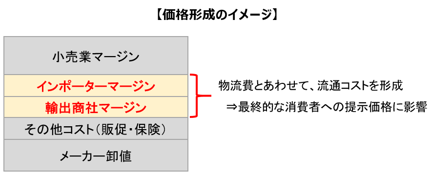輸出においては、商流に輸出商社やインポーターが入ることによって、最終的な消費者への提示価格は国内よりも上昇することが一般的です(下図)。