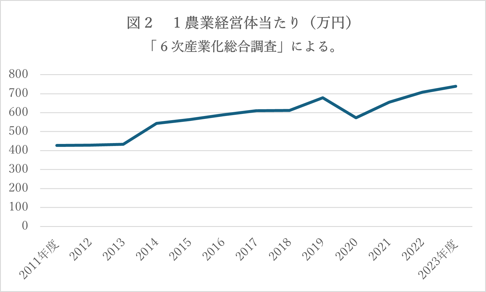 次に、1戸(経営体)当たりの年間売上金額の動向をみると、2013年度は433万円、2018年度は612万円、2023年度は739万円(2013年度比70.7%増)と伸びています(図2参照)。