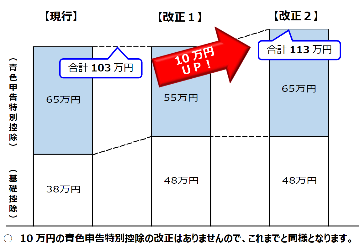 ただし、e-Taxによる電子申告または電子帳簿保存を行う場合は、引き続き65万円の青色申告特別控除が受けられます。