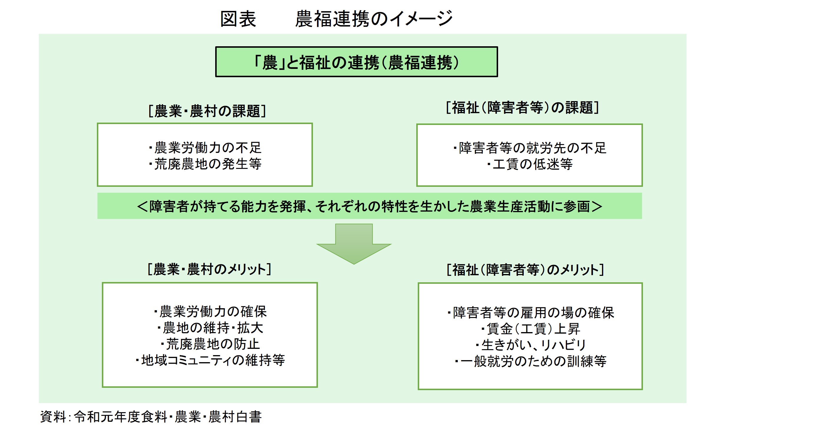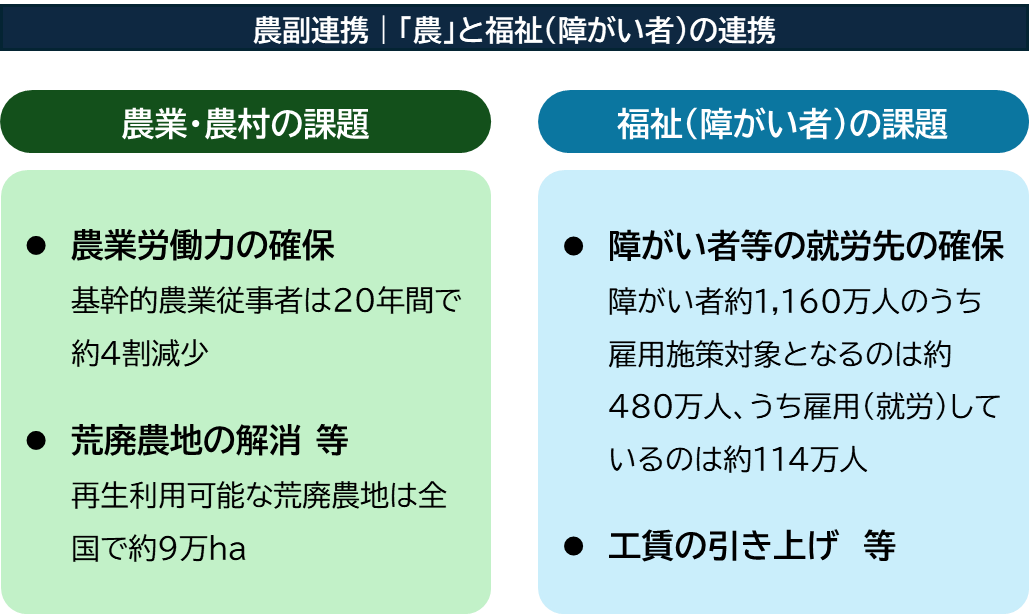 働き手の確保や荒廃農地の解消等が課題の農業分野、就労先の不足や工賃、賃金の低さ等が課題の福祉分野の双方が、互いの課題解決と利益の享受を相互の連携に見出した動き(Win-Winの取組)とも考えられます