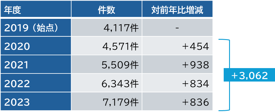 2019〜2023年の4年間で、新たに3,062件の農福連携の取組主体が新たに創出され、「農福連携等推進ビジョン」(「農福連携等推進会議」2019年決定)が掲げた2024年度末目標「農福連携に取り組む主体を新たに3,000創出」を達成しております。(下表参照)。