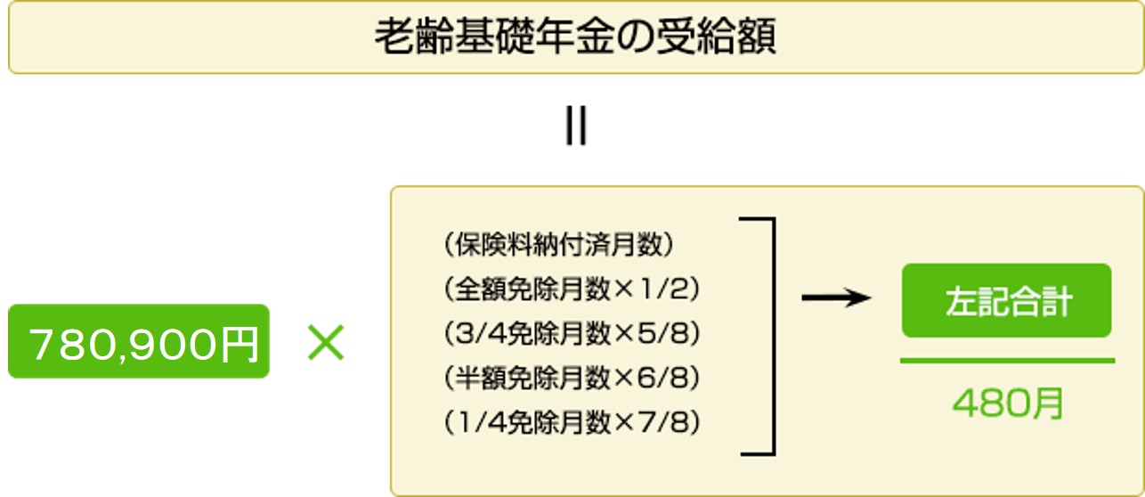 ※2 保険料免除期間とは、保険料納付の免除を認められた期間で、全額免除期間の年金額は1/2(平成21年3月分までは1/3)に、3/4免除期間の年金額は5/8(平成21年3月分までは1/2)、半額免除期間の年金額は6/8(平成21年3月分までは2/3)に、1/4免除期間の年金額は7/8(平成21年3月分までは5/6)になる。
