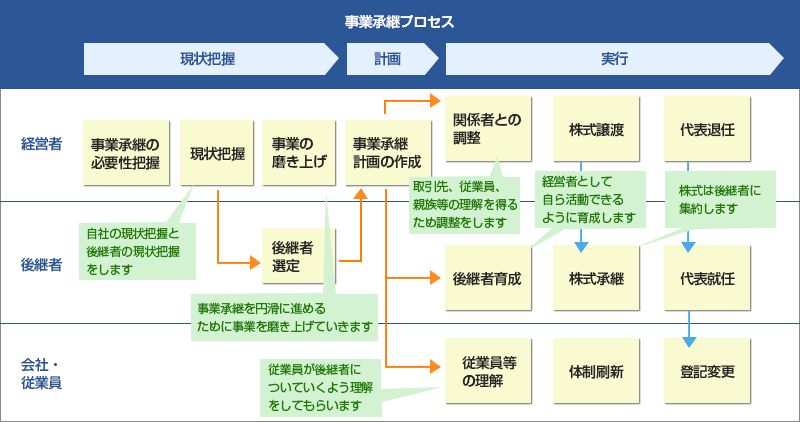 事業承継の全体の流れは、現状把握から計画、実行の流れで行われ、5年から10年程度の時間をかけてしっかりと行う必要のある仕事です。