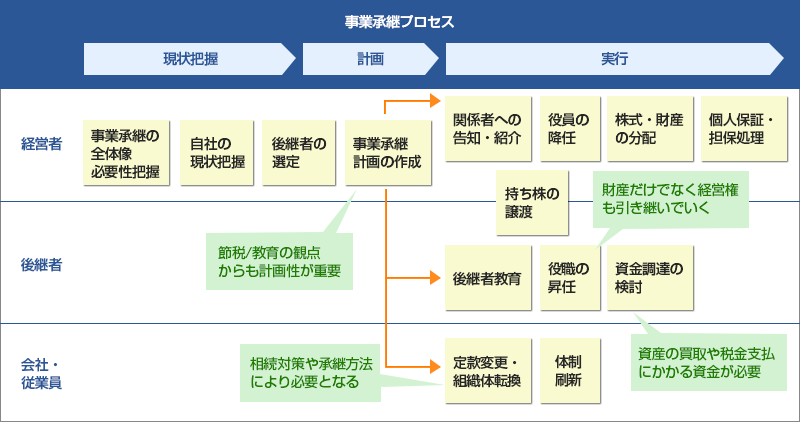 事業承継の全体の流れとしては、現状把握から計画、実行の流れで行われ、通常2〜3年、長くて10年の歳月を要し、時間をかけてしっかり行う必要のある作業です。