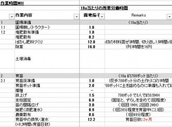 これらの作業リストと必要時間数が分かることで、どの作業に時間を要しているかが明らかになり、生産性を向上させるためのアプローチが見えてきます。また、その作物の栽培面積を拡大するときや、従業員を雇うときの計画にも使えます。そして、この作業時間は、自分が栽培した野菜の価格を決定するためにも絶対に必要な数字になります。