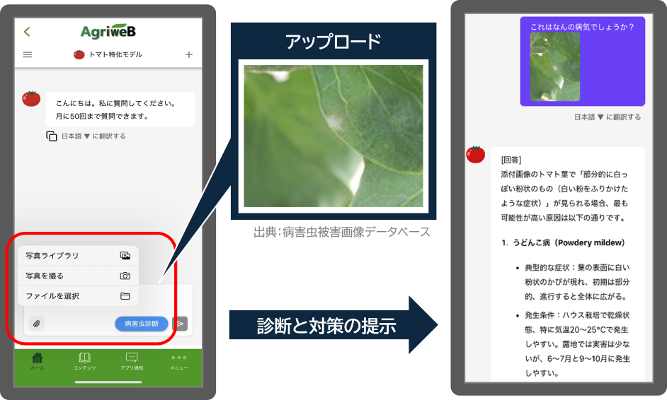 病変部の写真をアップロードするだけで、栽培アシストAIが病害虫を判別し、最適な対策を即座に提案することが可能となります。