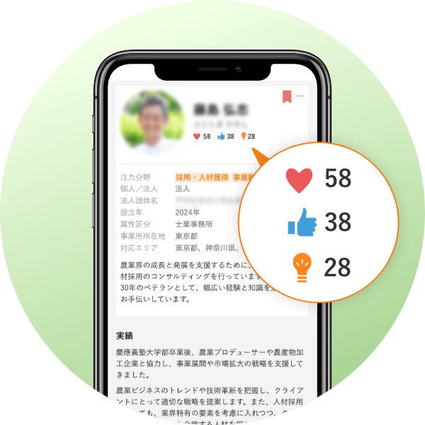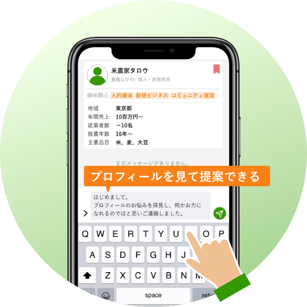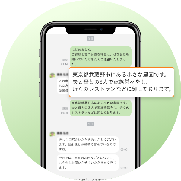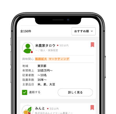 農業者や就農希望者が、各分野の専門家の対応領域や実績を探索し、サービスに関連した相談ができるチャット機能です。悩みに寄り添う適切な"アシスト"によって、相互に実りのある信頼関係を構築できます。